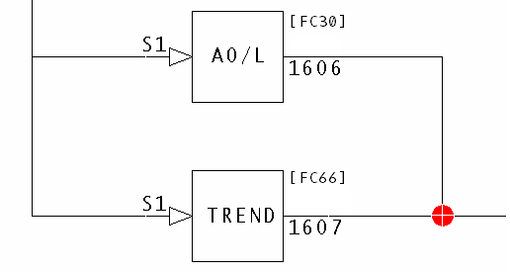 It appears that the signal from the two function codes shown are coming into a connector at the coordinates indicated. More than one input to connector at 6860,5960: Block 1606 (FC 30) and Block 1607 (FC 66).